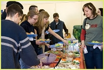 为了健康的心、灵与环境 多伦多同修参加了由总部设在多伦多的动物权利团体“不羁的心”(Wild at Heart)所发起的第三届加拿大“无肉日”活动。现场准备了美味的素食自助餐,并悬挂着“为了健康的心、灵与环境”的标语。