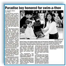 丹尼尔是天堂市260童子军团的一员。为了获得所属童子军团颁发的世界保育奖章,他于2月15日星期五在一处室外游泳池举行一场游泳马拉松,缔造两小时内来回游189趟的佳绩,为世界自然基金会”(World Wildlife Fund)募得了美金889元,用以帮助北极熊。他向赞助者解释说:北极熊由于栖息地遭受冰层融解的威胁,致使数量岌岌可危,加上人类又在他们的土地上乱丢垃圾,更使其处境雪上加霜。 在颁奖典礼中,该校校长蜜雪儿.琼斯女士(Michelle Jones)向全校师生宣读清海无上师的感谢函全文,以表彰丹尼尔的慈悲善行,并鼓励他人效法其典范。丹尼尔谦逊地接受颁奖,并怀着感激之情向大家宣布,他决定将这三千美元捐给“世界自然基金会”,藉由医疗照护、科学研究、食物供应和保护他们的栖息地等方式,进一步帮助41只北极熊。 丹尼尔无私奉献的精神,使世界会会员深受感动,因为他决定每年将用来购买圣诞礼物的钱,透过“世界自然基金会”认养一只动物,再把这些完成认养手续的完整资料当作礼物送给所爱的人。而他的家人也都赞成这项决定,且将全力支持他。 这位九岁男孩激励人心的义行,已使他周遭所有人了解到北极熊的困境,并让大家明了,即使像他这样小小的年纪,也能够凭藉一己之力为整个社区带来改变。丹尼尔无私奉献的精神,帮助我们珍贵的星球开创更光明的未来。