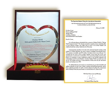 黄金5年(2008年)4月24日,清海无上师世界会的代表前往英格兰西南部美丽的多塞特(Dorset),将“全球优秀爱心奖”颁给“猿猴世界”(Monkey World)的园长爱丽森.克罗宁博士(Dr. Alison Cronin)。 爱丽森.克罗宁博士凭着百般努力与坚毅的精神,从智利一处动物实验室营救了88只被囚禁在狭小笼子里的僧帽猴,其中有些已被关了20年之久。当获颁奖项与师父爱心捐赠的五千美元时,爱丽森表示:“这笔善款将全部用来帮助更多猿猴和猩猩。”她由衷感谢师父的肯定,并且想邀请师父参观他们目前设于悠乐的营救中心,以及在多塞特的“猿猴世界”。她也欣然接受包括《高贵的野生》和《真爱奇遇--我的鸟羽兄弟》等书籍在内的赠礼。 在英格兰西南部广为流通的《每日回响报》(Daily Echo),刊登了一篇关于此次颁奖活动的文章,文中提到爱丽森.克罗宁所讲的话:“我感到既荣幸又高兴,尤其这份奖项旨在表彰慈悲善行,而我们的世界正需要更多这样的义行。”透过这次颁奖活动,让我们有大好机会与高雅人士和动物分享师父无边的圣爱。