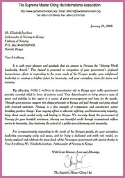 雅克布森女士说∶“挪威一直非常关心去年底与今年初肯亚选举后所发生的暴力冲突,我们对那些颠沛流离而栖身于难民营的民众,特别是裂谷(Rift Valley)民众所处的困境,感到非常难过。”在那段动荡不安的时期,挪威政府提供肯亚人民大量的金钱资助,为他们带来极大的希望与鼓励。 雅克布森女士非常惊喜,并十分感激地接受奖牌与师父的一些出版品,包括《高贵的野生》、《上帝照顾一切》和DVD。感谢挪威展现爱心、慈悲与慷慨,协助世界上比较不幸的人,树立了激励人心的典范。