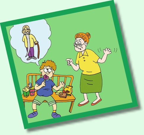 一个小男孩坐在公园里吃东西,一位老太太走过来告诉他:“孩子,难道你不知道吃这些甜食会蛀牙,甚至使你生病吗?”小男孩回答:“喔,我祖父可是活了120岁呢!”老太太就说:“但是他会像你一样一次就吃完一大袋甜食吗?”小男孩说:“不,不会,但是他从不多管闲事。”