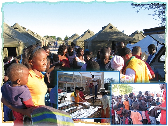 位于非洲西南部的纳米比亚(Namibia)拥有丰富的动植物资源,并以广大的沙漠著称。今年由于出现了不寻常的丰沛雨量,导致纳米比亚北部许多地区发生水灾。慈悲的师父得知后,立刻指示同修前往协助水患灾民,并慷慨捐赠二万美元资助赈灾工作。约翰尼斯堡小中心的同修接到师父的指示并得知当地人民所面临的困境后,立即展开救援行动。 4月28日,同修搭机抵达纳米比亚首都温荷克(Windhoek),并于隔天开车前往奥沙纳地区(Oshana)的欧沙卡第(Oshakati)。在路上,我们购买了水净化药片、毯子、婴儿奶粉与肥皂等物资。纳米比亚政府已在欧沙卡第成立了一个水患监控小组,大部分灾情也都获得控制。监控小组提供一份灾民迫切需要的物资清单,并善意建议同修到一家大批发商购买。同修随即购买了更多的食物与卫生用品,并运送到政府设置的仓库,以便每周发放给灾民。大批发商的经理非常热心协助,他捐赠了600个美耐皿餐盘,并督导物资的运送,还给予我们优惠的折扣。
