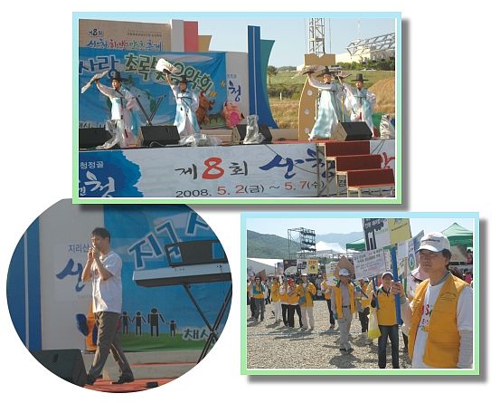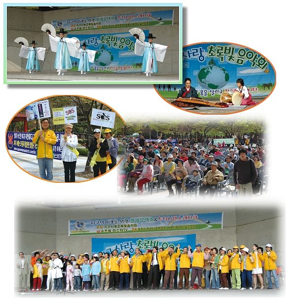 欢庆第八届山清药草节 为协助拯救地球,同修应县政府的邀请参加5月5日第八届山清药草节活动。当天刚好是韩国的儿童节,来自全国各地的成千上万民众都前来参加这场活动。许多人询问全球暖化与素食的关联,并赞许同修的努力。有一对夫妻想要多了解世界会,还有一位老人家主动协助我们的活动。 同修还在活动中的环保音乐会表演节目,透过歌唱、舞蹈及陶笛和韩国传统乐器的演奏,将素食和全球暖化的讯息传达给现场听众,让他们了解选择这项健康生活方式来拯救我们星球的重要性。