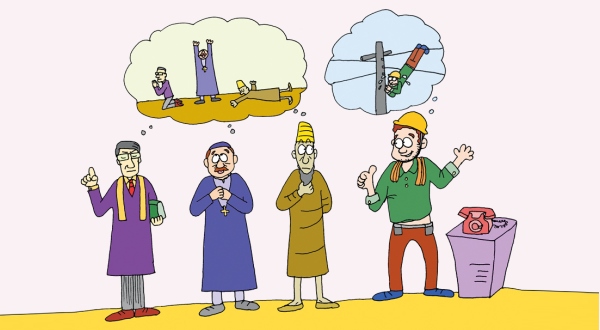 此时修电话的工人打断他们,说道:“各位,很抱歉打断你们。有一次我整个人倒挂在电线杆时,那次的祈祷效果最好!”