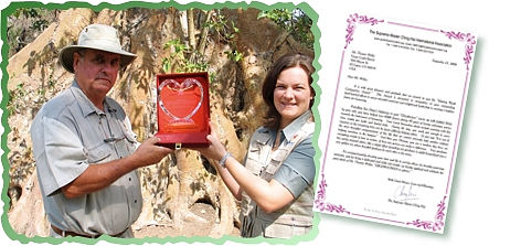 师父慷慨捐赠了五千美元以协助琼斯先生从事这份高雅的工作。他很高兴地收下这笔捐款,也很喜欢他所获颁的精美奖牌。他很担心野生动物的栖地遭受破坏,及其对生命自然循环所造成的冲击。由于他终日与动物及大自然为伍,所以他每天都留意到全球暖化所带来的影响。琼斯先生除了对师父表达莫大的感激外,也表示他会深深珍惜这份特别的奖励。