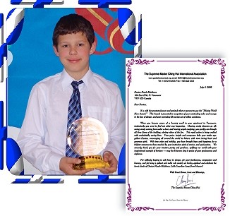 清海无上师在得知达斯坦的机智和英勇行为后,决定颁予「全球优秀英雄奖」给这名年轻的男孩。颁奖仪式于10月25日在同修所经营的天堂素面馆(Paradise Vegetarian Noodle House)举行。达斯坦获赠一面精美的水晶奖牌,还有一封师父的褒奖函、师父的出版品,以及一件英雄T恤。他一拿到 T恤就立刻迫不及待地穿上。师父的表扬和礼物让这位年轻的英雄非常感动。他的父亲布莱恩.马修斯(Bryan Matthews)也因冒险折返公寓拯救他们饲养的猫而获赠一件英雄夹克。达斯坦的父母都为他们的儿子感到非常骄傲。