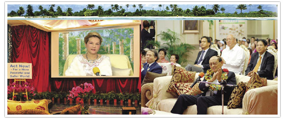 当日下午,罗慕斯总统在多位贵宾陪同下,莅临爱海艺文广场,这些贵宾包括:马尼拉经济文化办事处代表白熙礼大使(Antonio I. Basilio)、菲律宾克拉克特别经济区主席里萨利诺.纳瓦罗先生(Rizalino S. Navarro)、罗慕斯和平发展基金会执行董事拉古斯坦先生(Frumencio A. Lagustan)、福尔摩沙外交部亚东太平洋司秘书赵小姐及国家图书馆馆长顾敏先生等人。数百名同修以最热忱的方式夹道欢迎,罗慕斯总统频频竖起大拇指并挥手致意,场面热烈温馨。世界会理事长引领贵宾参观小中心,并赠予「紧急求救」口号休闲衫、帽子及师父的著作《天艺》等书,罗慕斯总统立刻回赠他的数本着作给师父。理事长还代表师父致赠天饰胸针「所罗门王的智慧」给总统,以赞扬他的智慧领导,同时赠送同款天饰耳环,请总统转给夫人。 随后同修和贵宾们与清海无上师进行视讯会议,主题为「立即行动!缔造更和平、更安全的世界」,由「无上师电视台」做全球现场直播。清海无上师和罗慕斯总统讨论到,以前双方曾帮助政治因素造成的不幸难民,现在则必须帮助因全球暖化而失去家园的环境难民。针对现今全球暖化的严峻情势,罗慕斯总统根据自己曾经担任国家公职的经验谈论环境保护,并认为国与国之间应形成互助的社群,相互合作,为世界的福祉尽一己之责;而全球的非政府组织,例如罗慕斯和平发展基金会及清海无上师世界会,也会在未来更紧密地携手合作,作为全球的模范,同声告诉世人有关气候变迁的重大威胁。