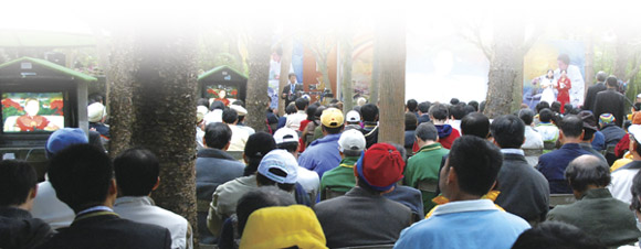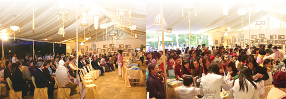 12日当天,贵宾们在世界会会员亲切的解说导览下,参观师父亲自开山辟土所创建的西湖道场。贵宾们惊叹道场本身就是一个环境艺术工程的绝妙之作,更对师徒在三日内建造「甘露河」、五天构建「九曲桥」的奇迹、师父爱心为孩童规划的「彩虹园」欢乐天堂,以及为维护生态环境而依山势打造的隐密灵修山洞等赞叹不已,并称赞西湖为「艺术家之家」。书法舞墨大师徐永进(图1)赞叹西湖道场的每棵树都很香,也都受到尊重,呈现人与人之间最需要的和平。水彩画家孙少英(图2)手不释卷地在当晚细细品赏《天艺》全书,并体悟到这样多元多采的艺术作品,只有「敬、爱、真」--敬天、爱万物、纯真、天真的人才能完成。贵宾们也在繁星点点的美丽夜晚享受丰盛的素食星光晚宴。