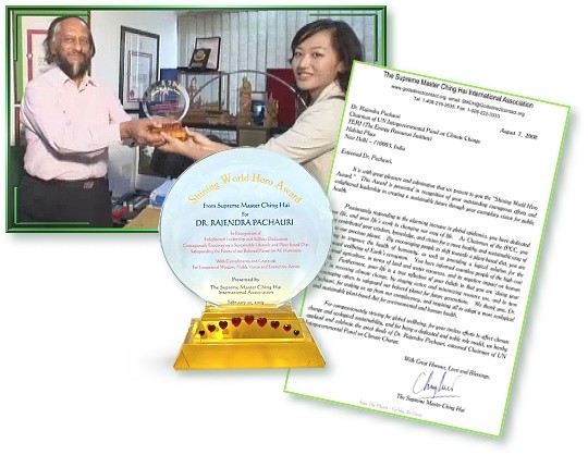 ~帕卓里博士 拉彦德拉.帕卓里博士(Dr. Rajendra K. Pachauri)是联合国跨政府气候变迁小组(Intergovernmental Panel on Climate Change,简称IPCC)的主席,并在印度一个专门研究与推动永续发展的组织「能源与资源研究所」(The Energy and Resources Institute,简称TERI)担任所长,他是当今研究气候变迁和地球永续发展的权威学者之一。 早在1980年代,帕卓里博士还是研究能源问题的博士生时,他就已经发现气候变迁会是一项极为严重的问题,人类必须改用碳排放较低的燃料。帕卓里博士在获颁2007年诺贝尔和平奖发表感言时,提到印度的哲学「Vasudhaiva Kutumbakam」,意思是「天下一家」,这个简单的词句,充分反映出帕卓里博士的智慧,这位谦虚、仁慈的智者努力提醒世人要注意迫在眉睫的气候变迁危机,以及真正能遏止暖化的方法。 帕卓里博士曾在许多场合表示,我们为了防止世界饥荒而推动许多工作,或是为了创造更环保的世界而种植更多的树木,但却成效不彰,因为我们没有从问题的根本着手--也就是我们所选择的食物。若世人听从帕卓里博士的建议而减少肉类的摄取,在帮忙减缓全球暖化上,每个人都将能扮演极为重要的角色。2008年,帕卓里博士提出「不吃肉、骑脚踏车、少消费,就可协助遏止全球暖化」,这项勇敢直言的建议成为各国媒体的头条新闻。之后,他应邀参与许多研讨会发表演说,直指气候变迁问题与畜牧业之间的关联,并向听众阐述许多极为重要的事实。 本身严格持素的帕卓里博士在世界各地奔走,敦促世人改采植物性饮食。今年5月,帕卓里博士前往比利时根特市(Ghent)参加一场研讨会。根特市的市议会因而受到启发,决定尽一己之力帮助世界对抗全球暖化,并正式将周四订为该市的「素食日」。 清海无上师为表彰帕卓里博士的杰出成就和明智领导,向世人阐明遏止全球暖化与开创永续未来的有效方法,因此颁予帕卓里博士「全球优秀英雄奖」。黄金6年(2009年)6月11日,世界会会员拜访印度能源与资源研究所,颁发奖牌给帕卓里博士,并传达师父对这位高尚的英雄由衷的敬佩与感激。帕卓里博士在接受奖牌和其它礼物时谦虚地表示:「我要向付出卓越贡献的清海无上师致敬,她敦促世界各地的人们采取行动,为居住在这个星球上的人类和所有众生开创永续的未来。我也要为荣获这个奖表达我的感谢之意。……我希望大家能一起努力,迈向永续、环保以及维护大地的未来,因为我们真的别无选择了。」此外,帕卓里博士也表示希望将来有荣幸能与师父会面。