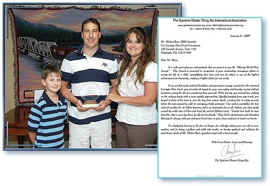 默林.韩先生(Merlin Harn)最近荣获清海无上师颁赠「全球优秀英雄奖」,以表彰他「为同胞牺牲的真正精神」,以及在生活中奉行古老的《圣经》章句:「人为朋友舍命,人的爱心没有比这个大的。」 2007年9月1日,默林.韩与妻子泰瑞莎(Teresa)在购物后回家的路上,看到两个没人看管的儿童在铁轨附近玩耍,其中一个3岁大的男孩竟在铁轨上游荡。由于担心小孩的安危,正在开车的泰瑞莎便把车停靠在路边,并立即拨打911电话报警。当她还在讲电话时,平交道的灯亮了,警铃声和汽笛声大作,一列挂有100节车厢、重达1万1千吨的火车正以35英里的时速朝那个孩子迎面驶来。韩先生看到飞驰而来的火车,立即冲向铁轨抱起孩子,把他带到安全的地方,剎那间火车疾驶而过。巧合的是,韩先生当天刚好穿着慢跑鞋,而非平常惯穿的凉鞋。 黄金6年(2009年)4月25日,伊利诺小中心新闻组将这个奖项颁赠给默林.韩先生,在场观礼的有当时参与救援的泰瑞莎和露出骄傲笑容的儿子。韩先生在受访时表示,事情发生时,他一心只想要救那名男孩,没有片刻犹豫。他提及大众的回响以及他和妻子所受到的注意令他惊讶不已,这使他了解到现在这个时代,人们特别喜爱那些能带给他们希望和鼓励的故事。当天驾驶那列火车的工程师戈登.希尔(Gordon Hill),亦赠予他一份特别礼物。此外,他还获颁「卡内基英雄奖章」(Carnegie Heroes Medal)、当地警察局颁赠的「英勇市民奖」(Civilian Award of Gallantry Plaque),以及美国众议院的表扬。另外,他儿子所就读的学校也邀请他就英勇精神与关怀他人的主题发表演说。
