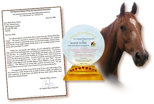 黄金6年(2009年)2月初,澳洲维多利亚州(Victoria)的一匹骏马杰尼.马可(Jeune Mark)成为当地严重森林大火中的英雄。火灾发生时,杰尼.马可和他的照护者安东尼.希斯顿(Anthony Sexton)被四周的火墙围住,于是马儿设法推安东尼越过护栏,让他滚落到特拉贡溪(Traralgon Creek),然后杰尼.马可则直接穿越火墙,回到希斯顿先生的农场。安东尼为躲避大火在溪中待了好几个小时,当时他四周的树木因烈火燃烧而发出爆裂声,同时还夹杂着狂风的怒吼,他相信自己一定是受到庇佑,所以才毫发无伤。火势在几个小时后平息,安东尼回到他的农场,心想自己可能无法再见到心爱的马儿了,然而他却发现杰尼.马可居然奇迹般的幸存着,令他感到十分欣喜!虽然马儿的脸和身体有部分被烧伤。当晚安东尼就睡在马儿的身旁,而杰尼.马可也在几个月后完全康复。