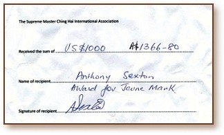 清海无上师获悉杰尼.马可无私拯救生命的英勇举动后,于4月27日颁予他「全球优秀英雄奖」和1千美元,以及一些美味的胡萝卜与苹果。安东尼.希斯顿先生也获赠师父的出版品。