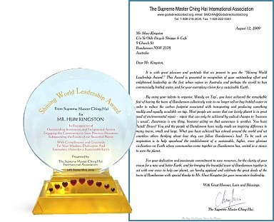 澳洲雪梨新闻组(原文为英文) 邦达努镇(Bundanoon)开创澳洲和全球的先例,率先禁止贩卖瓶装水,藉此为环保多尽一分心力。当地镇民自行筹办「邦地自来水」(Bundy on Tap)活动,这项以该镇别名「邦地」为主题的活动,其成果就是促使当局颁行这项禁令。清海无上师颁予此活动的主办人霍.金斯顿先生(Huw Kingston)「全球优秀领导奖」,以表扬其卓越的创举,以及在这项环保运动中扮演的关键角色。
