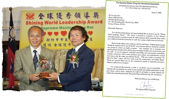 去年5月,清海无上师世界会会员拜会新竹市政府,传达蔬食抗暖化的讯息时,市长林政则先生相当支持与推崇我们的理念。不久,在市长与市府的支持协助下,世界会分别于新竹市政府及新竹科学工业园区同业公会各举办了一场「全球抗暖化.蔬食救地球」百万人联署记者会。林市长不仅联署参与这项有意义的活动,也呼吁大家少吃肉、多吃当地蔬果,为维护地球尽一分心力。由于市长的响应与号召,带动了更多市民正视蔬食抗暖化的效益。为表彰市长杰出的领导典范,协助提升及保护我们美丽的世界,世界会会员于黄金6年(2009年)8月11日拜访市长办公室,代表清海无上师颁发「全球优秀领导奖」给林市长。
