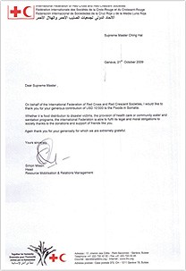 Cross and Red Crescent Societies,简称IFRC)的协助,师父的捐款及时发挥了功效,在水灾最严重的地区适时为灾民提供粮食、住所与医疗照护。之后,红十字会与红新月会国际联合会也致函感谢师父的慷慨捐赠与关怀。我们祈祷索马利亚灾民得到慰藉,并得以安返他们的家园。