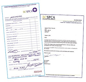 | 卑诗省防止虐待动物协会的感谢函与收据 |