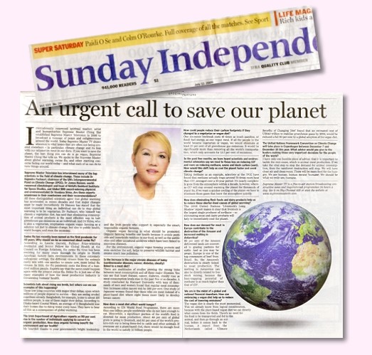 答:我由衷感谢贵国政府的英明领导以及拥护政府的爱尔兰人民,尤其是聪明、负责的有机农友。有机纯素农业是我们应该大力推广的。有机农业有益我们的健康,因为它让我们的食物没有农药和杀虫剂残留,也免于抗生素和其它人工添加物的危害,这些物质与无数的疾病有关。对环境而言,有机纯素农业保护并滋养土壤,有助于维护野生动物的栖地,而且会减少许多的污染。