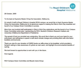 【墨尔本讯】澳洲一年一度的「骑单车上班日」(Ride to Work Day)于黄金6年(2009年)10月14日星期三举行。墨尔本皇家儿童医院(Royal Children's Hospital)的工作人员也共襄盛举,活动现场提供了当地世界会会员所准备的美味纯素早餐。 医生、护士、医疗研究人员和其它岗位的员工皆一起享用同修所提供的水果色拉、纯素松饼、苹果派和纯素法式咸派。也有很多人到询问台与我们世界会会员交流对谈,并接受免费的DVD、传单和小册子,这些文宣品的内容涵盖纯素饮食的营养和健康,以及气候变迁与能够解决暖化问题的纯素饮食。 皇家儿童医院「骑单车上班日」活动的主办人员很感谢同修提供这些素食,并在感谢函中写道:「你们所提供的素食获得广大的回响。我们要感谢您和贵团队的热忱,自动自发为我们的工作人员阐述气候变迁,以及提供相关信息的文宣和手册。」 这次活动有一百多位员工参加,其中许多人都是生平第一次得知我们饮食的选择也会对地球产生许多层面的影响。