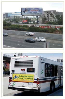 Outdoor)洽询后,以优惠价买到非常好的广告牌设置地点。一面刊登有「请茹素!素食能遏止80%全球暖化!」的「紧急求救」宣传广告牌,就矗立在硅谷的核心地带,靠近两条主要州际高速公路的交会处,有二百多万人看到此广告牌的讯息。第二面「紧急求救」宣传广告牌则设置在旧金山国际机场附近。第三面也即将设置,将刊登4个星期。世界会会员非常感激,也很高兴能在湾区与广大民众一起分享师父的讯息。