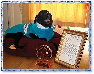 有感于托比的高度聪慧与勇气,清海无上师颁予他“全球优秀英雄奖”。黄金6年(2009年)8月6日,世界会会员颁赠精美的奖牌与师父赠送的许多礼物给他,包括一件快乐狗外套、一张狗床,以及用以购买素食狗食和点心的500英镑。他的照护者也获赠精选的师父著作、DVD和一些纯素巧克力。 我们一起向忠心耿耿又有爱心的英雄托比致敬,您无疑是天使的化身,也是您的人类同伴的真正福气。祝您与您关爱的家人共享许多快乐珍贵的时光。
