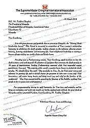 额勒贝格道尔吉总统一直致力于透明诚信的治理、媒体言论自由、消弭贫穷及环保。在2009年12月丹麦哥本哈根的联合国气候变迁会议上,总统阁下接受“无上师电视台”采访时提到,若畜牧业能改为纯素农业,对环境和人民会更加有益。 为表彰该国在司法制度上做出改革,使其更具宽容、帮助人们改过迁善并珍视生命的杰出慈悲行动,清海无上师颁发“全球优秀领导奖”给蒙古,由世界会会员于4月23日在额勒贝格道尔吉总统的办公室颁赠给他。他亲切地接受这项荣誉,并表达了对清海无上师的诚挚谢意。 我们向查希亚.额勒贝格道尔吉总统拥护生命与慈悲的高雅立场致敬。祈愿这样的领导风范能鼓舞所有决策者也同样宽大仁慈,以造福蒙古乃至全世界。