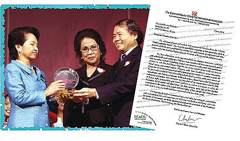 菲律宾前总统格洛丽亚.马卡帕加尔-雅罗育夫人(Gloria Macapagal-Arroyo)在位9年后,于黄金7年(2010年)6月正式卸任。菲律宾人民为了表达对雅罗育总统伟大贡献的感激之情,举办了一系列的感恩庆祝活动,其中最隆重的一场是在马尼拉极负盛名的圣保罗大学大会堂举行。菲律宾国家文化艺术委员会(National Commission for Culture and the Arts)执行长西西莉.吉达特.亚凡瑞兹女士(Cecile Guidote-Alvarez)特别致函邀请多年来爱心关怀菲律宾人民并不时捐款救助当地灾民的清海无上师参加这场盛会。师父有感于雅罗育总统在位期间致力提升菲律宾,维护国家安全和经济稳定,并促进和平繁荣与社会福祉,为人民开创更光明的未来,特颁赠“全球优秀领导奖”,并委派代表团专程参加。