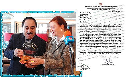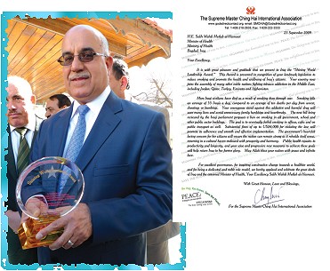 黄金7年(2010年)1月20日,世界会会员在约旦首都安曼(Amman)的第1个伊拉克卫生处开幕仪式上,颁赠奖牌和裱框的师父褒奖函给伊拉克卫生部长沙利.马迪.穆特拉伯.阿尔–哈斯纳维先生(Salih Mahdi Mutlab al-Hasnawi)。伊拉克卫生部长、约旦卫生部长、伊拉克大使,以及来自联合国难民署(UNHCR)、世界卫生组织(WHO)、美国援外合作社(CARE)、国际红十字会等大型非政府组织和其他许多组织近200名重要贵宾,都参加了颁奖仪式。13家电视台及“无上师电视台”也都来到现场报导这场活动,而许多政府官员也收到师父的DVD和书籍。 阿尔–哈斯纳维先生在颁奖典礼上感动得热泪盈眶。伊拉克部长、约旦部长、大使及其他在场官员,都对师父传递的讯息抱持崇高的理解与认同。