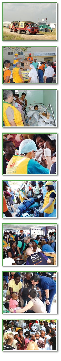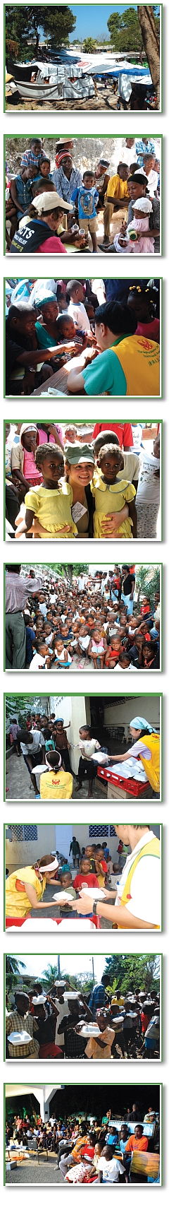 2010年1月12日,海地遭受规模7.0的强烈地震袭击,让举世为之震惊。这是当地200年来最大的一次地震,震央位于距离首都太子港仅16英里的利奥甘尼镇(Léogâne)附近,之后又发生了一连串余震。这次地震毁损了大多数的基础设施和建筑物,包括司法院、国会大厦、最高法院和太子港大教堂。据估计,有超过23万人丧生、30万人受伤,还有一百多万人无家可归。 来自全球各地的世界会会员迅速组成一支救援队前往海地,和其他许多热心的国际救援组织一起投入救灾工作,在接下来的3个月中为困苦的灾民带来物资与精神上的慰藉。驻留期间,由于慈爱的清海无上师源源不绝的资金援助总计11万美元,及世界会会员的捐献,工作队得以每天供应纯素餐点给数千人、为儿童和伤患提供医疗护理,并分发亟需的食物、药品、帐篷、玩具和衣物。一位身为医生的华人师兄一心为了减轻灾民痛苦而日以继夜地工作,有时甚至一天之内在流动诊所治疗了132位病患。 当我们的医疗支援队于1月份抵达多明尼加共和国时,他们为当地医院带来了海地伤患截肢或动其他专门手术所需的药品,医生们对此极为感激。而当医疗队到达海地时,看到街上有这么多伤患等着被送去医院接受所需的治疗,都心如刀割。为了帮忙纾解这种情势,他们甚至借用民防局的一部汽车充当救护车,尽可能运送许多伤患到医院,让他们在现有条件下获得最好的照料。 几天后,我们的工作队来到他们在海地期间的工作基地--基督复临安息日会医院(Adventist Hospital),并应慈善组织“积极社区服务队”(Active Community Teams Serving,简称ACTS)和医院的主管之请求,开始为医院的员工、病人及其家属每天准备两次1,200份的餐点。这些纯素食物大获好评,许多海地人天天都引颈企盼吃到这两顿饭。后来,工作组每天都得准备3,500 至4,000份餐点才能满足大众的需求。许多非素食者很惊喜地发现这些食物竟然如此美味,并表示如果他们能取得烹调这些佳肴的食材,他们也会开始吃纯素。