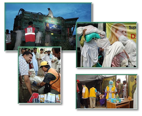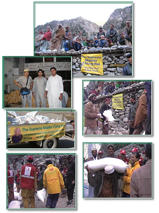 清海无上师获悉灾情后,立即传达她最深切的关怀和祝祷,并提供总计11万5千美元的援助金,以资助印尼和福尔摩沙的世界会会员对灾民所展开的救援行动和医疗服务。 福尔摩沙的世界会救援队于8月5日抵达灾区,在全方位环保协会的帮助下,准备了885包食物,包括米、面粉、豆类、糖、盐和植物油,送往瑙沙罗费洛兹县亟需救助的地方。师父仿佛听到受苦民众的祈求,特别指示另一支受过医疗和牙科训练的救援队前往灾区,照顾灾民的需求。这支救援队于8月19日抵达喀拉蚩(Karachi),并从红新月会的夏先生(Shah)和全方位环保协会的艾比德先生(Abid)处得知,由于水和食物不卫生,所以迫切需要医疗救助。于是世界会会员在接下来的3天,先后在一所小学及一处收容所,从早到晚为众多患者进行治疗。此外,他们还提供750包食物和200顶帐篷给印度河流域的灾民。 8月27日至9月10日,来自印尼的同修在贾尔瑟达县(Charsadda)和喀拉蚩县展开救援工作。即使洪水已消退将近一个月,当地的偏远村庄仍有一些人难以回复正常的生活。在贾尔瑟达县,救援队与崇高目标福祉协会(Noble Aims Welfare Association,简称NAWA)的阿里.伊姆朗先生(Ali Imran)合作提供医疗服务,并分发装有食物、肥皂和清洁剂的救援包给2千户尚未收到任何援助的受灾家庭。救援队要感谢贾尔瑟达县议会的议员斯堪德.谢尔鲍先生(Skandar Shairpao)和巴基斯坦前国防部长的公子阿夫塔博.阿默德.罕.谢尔鲍先生(Aftab Ahmed Khan Shairpao),后者不仅慷慨出借自己的地方让救援队发放救灾物资,还在救援队于当地执行任务期间为他们提供安全护卫。 9月4日,世界会会员抵达喀拉蚩。在与信德省的巴基斯坦红新月会(Pakistani Red Crescent Society,简称PRCS)秘书康瓦.瓦辛先生(Kanwar Waseem)和医疗救助工作主管赛伊德.阿里医生(Syed Ali)合作下,救援队一共提供了8个急救箱,每箱装有可供500人接受现有医疗服务的医疗用品。救援队也与巴基斯坦红新月会携手合作,为特达市(Thatta)周边灾民营内的许多民众提供免费的医疗服务。当救援队为最偏远的灾民营和附近物资匮乏的民众分发2,400瓶1公升的瓶装水时,他们看见一个小孩平静地与其他小孩分享自己所有的那瓶水,令同修们深受感动。