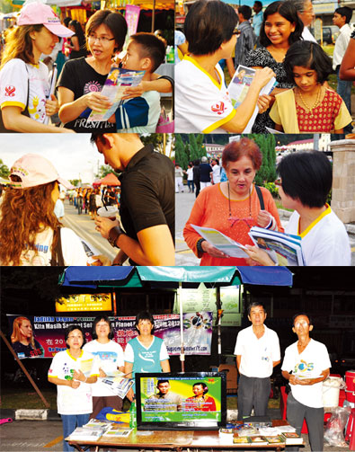 【槟城讯】黄金7年(2010年)7月23日至8月1日,大山脚圣安纳教堂(St. Anne's Church)欢庆一年一度的圣安纳庆典,庆典高潮是7月31日的圣安纳圣神游行。除了本地信徒,还有来自新加坡、英国、澳洲、泰国、印尼、菲律宾等国家的信徒也一起参加游行仪式。 槟城同修在活动中设置了摊位,并向大众宣传“吃素、环保来救地球!”的讯息。摊位上除了展示师父的书籍外,还播放“无上师电视台”节目,吸引了许多来宾前来询问,有些人还索取样书。几位同修也在人群中分发“紧急求救”传单,并为来宾解说吃素的重要性。