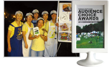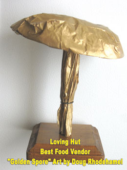 ![]() 这是“Loving Hut”第2次以纯素食品供应商的身分参加这项活动。今年他们的设备更为精良,而且所提供的美食种类也更加丰富。艺穗节的网站评论道:“每个尝过Loving Hut食物的人都一致认为,在艺穗节有这家素食/纯素食品供应商提供无肉的餐饮不仅令人雀跃,而且他们所提供的所有食物也确实非常可口。”活动结束时,“Loving Hut”被票选为2010年最佳餐饮商(Best Food Vendor)。此外,它还获颁道格.洛德汉梅尔(Doug Rhodehamel)创作的艺术作品“金孢子”(Golden Spore)和thedailycity.com 网站的观众推荐奖(Audience Choice Awards)。