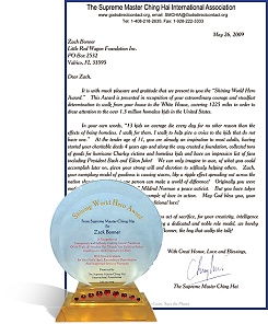 清海无上师获悉这位11岁男孩的慈善义举后,表达了对他由衷的赞赏,并颁发“全球优秀英雄奖”给他,还捐赠1万美元支持他的高雅工作。这些奖项由世界会会员于黄金6年(2009年)7月23日在佛州的坦帕市颁赠给扎克。师父在褒奖函中写道:“您表现出坚强意志和无私助人的奉献,我们唯有满怀敬意地想像您日后的成就。” 之后,扎克为了帮助弱势儿童,又在2010年9月完成一次横跨美国的徒步旅行,这次是从坦帕市到加州的洛杉矶,全程将近2,500英里。我们向扎克.邦纳的爱心和非凡成就致上最高的敬意。祈愿您对弱势民众的爱心关怀,可以激励更多人对贫困的儿童伸出援手,带给他们慰藉和希望。也希望您的红色小拖车继续滚动,带领所有儿童迈向更光明美好的未来。