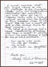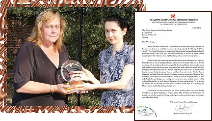 为了表彰凯斯利牺牲自己拯救挚爱所展现的超凡勇气,师父怀着无尽的爱和哀思追赠他“全球优秀英雄奖”,并捐款2,000美元资助他的追悼会,所有这些奖项于2010年9月26日致赠给凯斯利的家人。师父在褒奖函中表示慰问,写道:“凯斯利罕见的崇高气节令我们感动落泪,他的壮举将深深烙印在许多认识并深爱他的人心中。对我们而言,让一个行侠仗义的无辜者溘然长逝看似不公,但上天知道,而且福报正等待着他。” 在接受精美的水晶奖牌和诚挚的褒奖函时,特蕾西.伯吉斯感动得热泪盈眶。她写道:“我无法诉说这个奖对我的意义。”“感谢清海无上师世界会为我们所做的一切。凯斯利确实是一名少见而独特的青年。在他短暂的一生中,他感动了这么多人的生命。他有一副好心肠,总是那么乐于助人。” 我们向凯斯利的家人和朋友表达衷心的慰问和最深切的同情。祈愿凯斯利在上帝永恒的眷顾中安息,也希望他的骑士风范鼓舞更多人过着爱心无私的生活。