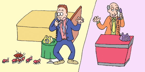 有个生意人住进旅馆的房间后,看到地板上有只死蟑螂,就打电话到服务台指名要找经理谈。
