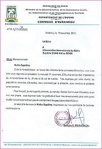 2010年10月发生在贝南的洪灾影响了约36 万人,有许多人无家可归,需要粮食救济,儿童罹患水媒传染病及疟疾的危险也不断增加。亚弗兰考镇(Avrankou)是灾区之一,附近好几个村落,如麦尔(Male)、坦尊(Tanzoun)和葛巴坡(Gbakpo)也都受到波及。师父提供7,500美元,以照顾灾民的紧急需求。11月17日,贝南的世界会会员前往亚弗兰考镇分发米、植物油和盐,并传达师父的爱心关怀。他们受到镇长乔治.诺南农先生(Georg S. Nounagnon)的热烈欢迎,镇长并写了一封感谢函给师父,以表达他和镇民最深挚的谢意。