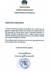 2010年10月中旬,连日豪雨使安哥拉的7个省分被洪水淹没,逾525户家庭被迫撤离,还有近800栋民宅和许多建筑物被毁损。此外,遍及全国至少有18人丧生、20人受伤。 清海无上师对此表达了她的衷心哀悼和祝祷,并捐赠1万5千美元的援助金。喀麦隆的世界会会员从地方政府得知莫希科省(Moxico)受灾最严重后,随即安排于12月29日飞往该省省会卢埃纳(Luena)。莫希科省的国家民防委员会(National Commission for Civil Protection)省指挥官洛克先生(Roque)不但前往机场接机,并迅速安排他们与省长若昂.埃内斯托.多斯.桑托斯先生(Joao Ernesto Dos Santos)会晤,协商救灾事宜。
