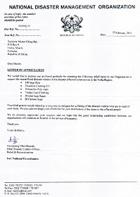 国家灾难管理组织的灾难控制处处长阿索曼宁.欧戴-曼萨先生(Asomaning Odei-Mensah),代表所有的受助灾民写了一封感谢函给师父,信中表示:“你们的善举确实大大缓解了灾民的痛苦,他们很需要这些物资。我们也要赞许你们合作分发物资给灾民的努力。我们衷心感谢你们的支持,也希望我们两个组织之间所建立的良好关系,能在服务人类的同时继续蓬勃发展。”