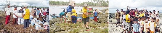 经与印尼巴东(Padang)红十字会洽询后,救援队采购了食物、水、帐篷、衣物、厨具和药品。他们先乘坐飞机再转搭船,经过数天的旅程后,终于在11月4日的深夜抵达明打威岛的西卡卡普港(Sikakap),并立即将急需的药品运送到西卡卡普诊所。次日,救援队与西苏门答腊灾害管理处合作,将所有的赈灾物资装上两艘小船,运往明打威群岛北巴盖岛(North Pagai)和南巴盖岛的8个村落,并分送给灾民,这些村落包括:马拉科帕蒙加(Malakopak Monga)、萨比列(Sabiret)、艾鲁帕拉波亚特(Eruparaboat)、小蒙特(Small Muntei)、大蒙特(Big Muntei)、普罗罗盖特(Purorogat)、蒙特巴鲁巴鲁(Muntei baru-baru)和阿萨汗(Asahan)。承蒙上帝恩典,途中船只虽数度抛锚,所幸都得以修复。受助者非常感激师父的及时援助,也向师父献上祝福与爱。