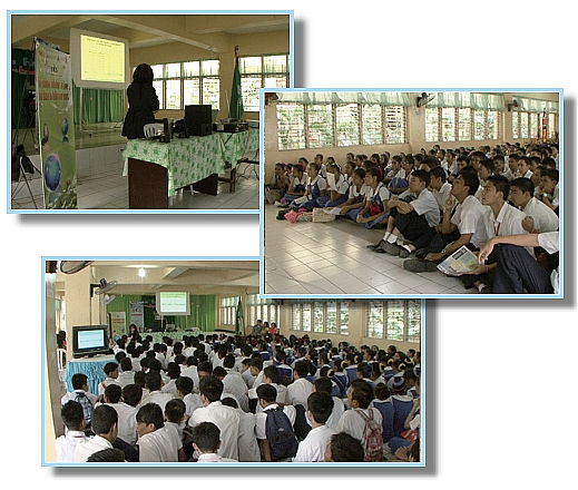 【马尼拉讯】自黄金8年(2011年)1月11日起,马尼拉小中心的世界会会员就在当地的高中,为学生举办了一系列有关纯素是全球暖化解决之道的讲座,这些学校包括帕拉纳克国立高中(Parañaque National)、圣露薏莎高中(Blessed Luisa)和巴克拉兰国立高中(Baclaran National),另外还有更多学校在筹划当中。讲座上,学生们专注聆听关于畜牧业对人类、动物朋友和地球造成毁灭性影响的说明。在“尊重所有生命”的单元中,则播放影片介绍我们动物朋友的才能和高雅爱心。此外,还分享了许多有关低碳植物性饮食所具有的高度营养价值的资讯。