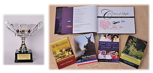 【台北讯】黄金8年(2011年)3月5日,由菲律宾前总统罗慕斯先生(Fidel V. Ramos)创立的罗慕斯和平发展基金会(Ramos Peace and Development Foundation),颁发“环保和人道主义奖”(Environmental Protection and Humanitarianism Award)给清海无上师,以表彰无上师多年来于世界各地致力推行环保方案和从事人道工作的卓越贡献。颁奖典礼在台北市一家素食餐厅举行,与会嘉宾包括罗慕斯先生、菲律宾驻台代表白熙礼先生(Antonio Basillio)和代表团成员,以及福尔摩沙和美国的政府官员与贵宾。 罗慕斯先生在致词时表示,清海无上师一直是菲律宾人民的好朋友;罗慕斯和平发展基金会虽是一个小基金会,但是致力从事很多工作,并从爱心、分享与勇气三个信念开始,除了照顾自己人,也照顾世界上所有需要的人和其他国家,希望为年轻人打造美好的未来。 在颁奖时,罗慕斯先生朗读奖杯上镌刻的文字,并解释何以奖杯的形状像个大碗钵,他说:“这个大碗将由世人在里面装满蔬果,相信各位在清海无上师的引领下,一定会克竟其功。”他也致赠亲笔签名的几本著作给师父。