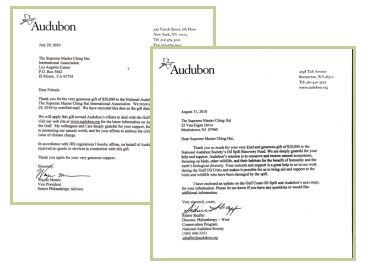 出于对受苦野生动物的深切关怀及悲悯,清海无上师捐赠2万美元给美国全国奥杜邦协会,以赞助他们保护落难动物及其家园的使命。该协会于黄金7年(2010年)7月29日收到这笔款项,副会长暨资深慈善顾问韦恩.蒙斯(Wayne Mones)在告知收到善款的信函中指出,这笔款项将用于奥杜邦处理墨西哥湾的漏油事件上。他还写道,他和同事们都非常感激师父的支持和致力保护我们的自然界,以及为解决气候变迁此一紧迫议题所付出的心力。 我们衷心感谢奥杜邦协会及满怀爱心的志工,在漏油事件中协助受灾的鸟类和其他动物。祈愿在上天的恩典下,这些动物能尽快复元,并再度在安全祥和的环境中成长茁壮。