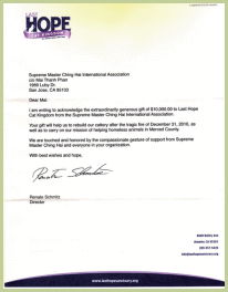 为了感谢师父极其慷慨的捐赠,舒密兹女士在信函中写道:“您的礼物将帮助我们在2010年12月31日的不幸火灾后重建猫舍,也帮助我们继续执行我们的使命,救助美熹德郡的流浪动物……能够获得清海无上师和贵组织成员的慈悲支持,令我们非常感动,也深感荣幸。” 我们祈愿“猫王国的最后希望”能迅速复原,以便继续执行他们在社区里救助流浪动物的使命。