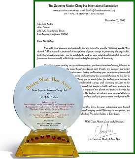 约翰不遗余力地推广素食,使他荣获清海无上师颁发的“全球优秀英雄奖”。在接受颁奖并阅读了师父的一些书籍后,他亲切邀请“无上师电视台”的工作人员到他的家中。他很少在私人住所中招待客人,但是他觉得我们的团体与众不同。“让他们进来吧!”他对他的助理这样说,“要知道,他们将会使我提升,而我希望也能对他们有所助益。” 约翰.沙里先生,我们赞扬您高贵、英勇的作为!感谢您在篮球界和生活方面都为我们树立成功的典范。祈愿上帝加持您未来的努力,以启发更多人过着健康、慈悲的理想生活。