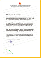 Hollande)称,得到此奖是一份“极大的荣耀”。当时的美国国务卿希拉蕊.柯林顿(Hillary Clinton)则称赞道:“21世纪欧洲的统一与和平,是我们有目共睹的。这绝非偶然,而是因为欧洲各国领导人与人民都非常努力奉献。”一听到此获奖喜讯,清海无上师立即致以下贺函给欧盟: