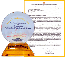 有鉴于该组织非凡的成就,清海无上师也颁发“全球优秀领导奖”给欧盟及欧洲理事会主席赫尔曼.阿奇莱.范龙佩阁下(Herman
