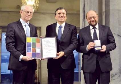 诺贝尔委员会主席托尔比约恩.亚格兰(Thorbjorn Jagland)在奥斯陆宣布此奖时,称欧盟已将大部分欧洲“从战争之洲转变为和平之洲”。法国总统法兰索瓦.欧兰德阁下(Francois
