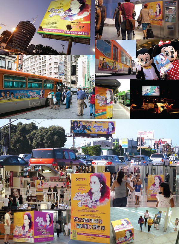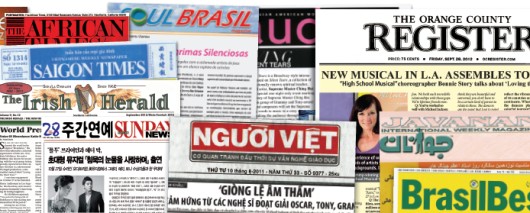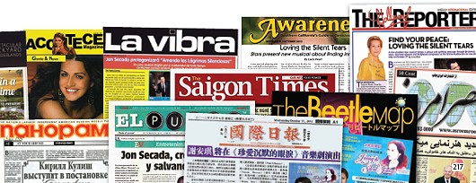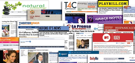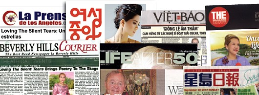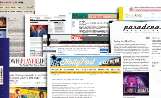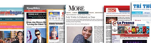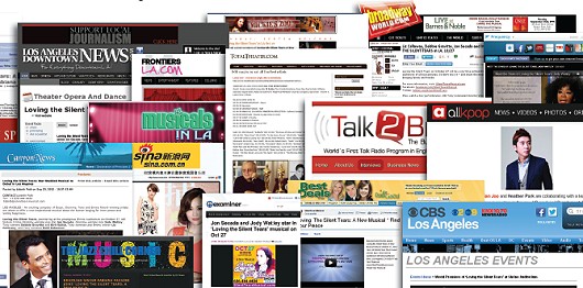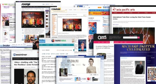 | 《珍爱沉默的眼泪》以横跨6大洲史诗般的旅程为特色,而针对这出音乐剧的报导,也藉由远至澳洲、牙买加、日本、印尼、泰国及香港等地的国际新闻媒体,传达给全球观众。此外,透过脸书(Facebook)和推特(Twitter)这类社交网站的积极流传,音乐剧的消息也迅速传到荷兰、加拿大、新加坡、德国和奈及利亚等地的乐迷耳中。包括报纸、杂志、电视、广播、网站以及社交媒体在内的各大主流媒体,更是纷纷热烈发布消息,并针对这出仅上演一场的音乐剧进行报导和评论。其范围之广,从当地媒体,如《洛杉矶时报》(Los Angeles Times)、《好莱坞报导》杂志(The Hollywood Reporter)、加州第9频道电视台(KCAL)等,到几家最大的族裔媒体集团,如“环视”电视网(Univision)(西班牙语)、《世界日报》(World Journal)(中文)、美国之音(Voice of America)(波斯语)、文化广播公司(MBC)9 点新闻(韩语)等都有。总共有远超过400家媒体在《珍爱沉默的眼泪》演出前后,帮忙告知大众相关的消息。以下是这些报导的部分摘要: | |||||||||||||||||||||||||||||||||||||||||||||||