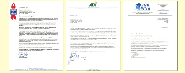 在盛会中受到清海无上师表彰的3个慈善机构来函表达谢意