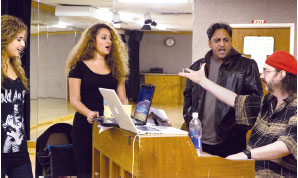| 与音乐总监道格.卡撒罗斯(坐在钢琴前者)以及同台演唱的丽儿.库莉特和席耶瓦什.夏姆斯一起排练 |  |  卡蜜莉.阿布-欧达:是这样的,我听到音乐时,如果觉得它颇能引起我的共鸣,让我有种不禁想要创作的冲动,旋律就会自然出现在脑海里。我不确定它是来自周遭环境或哪里,反正它就这么出现了。