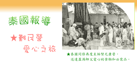 月初,曼谷同修到帕努尼康难民营,分送师父的礼物,并传达师父的爱心给难民之行时,由于当时营方首长表示,联合国即将停止对该营的财务帮助,请师父帮忙提供儿童奶粉、蔬菜种子、干粮及牙膏等必需品,听到上述这些话以后,我们马上知道这是上帝的旨意,必需赶紧去办。